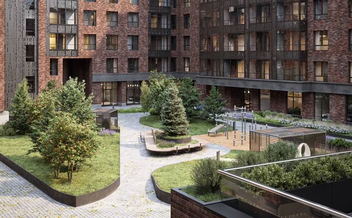 Вся территория жилого комплекса огорожена, въезд осуществляется через контрольно-пропускной пункт. Двор реализован по принципу «дворов без машин» — весь личный транспорт размещается на подземной парковке.