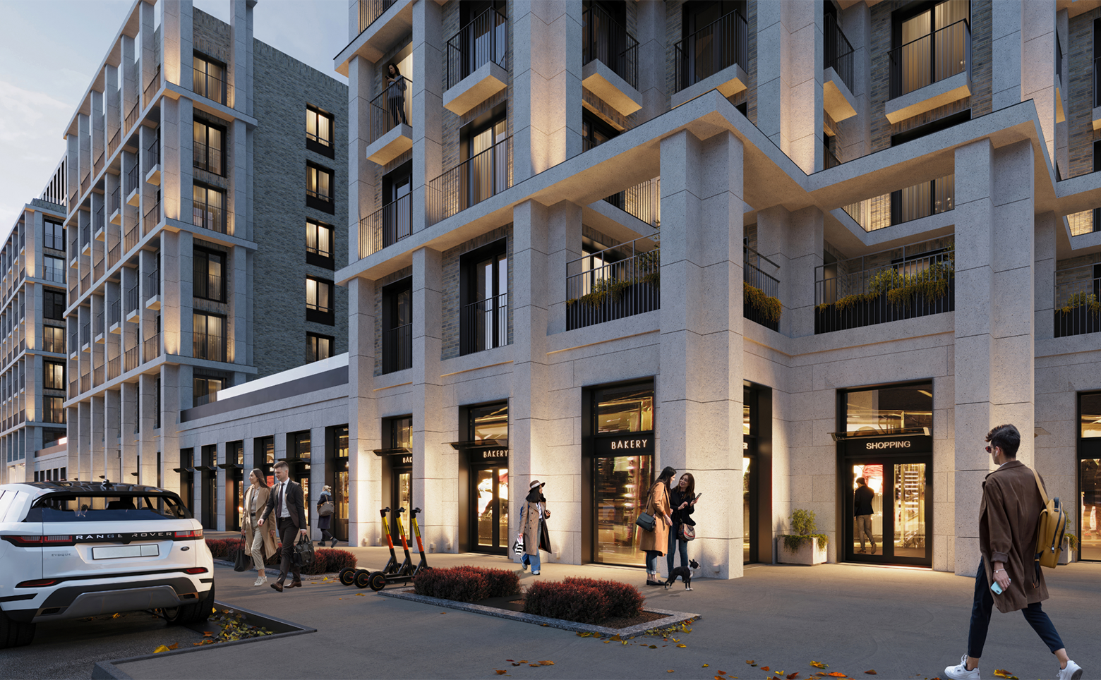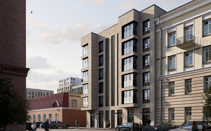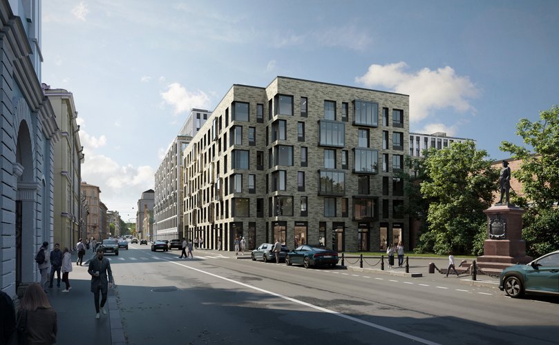 Архитектура: Фасады выполнены в неоклассическом стиле с использованием штукатурки, элементов рустовки и декоративных элементов, отсылающих к исторической застройке Петербурга.