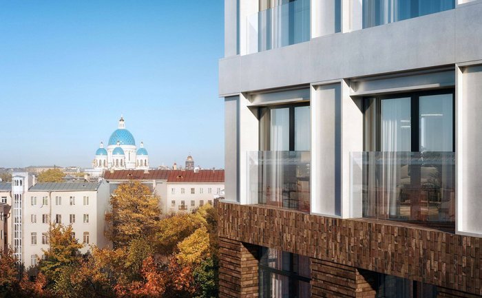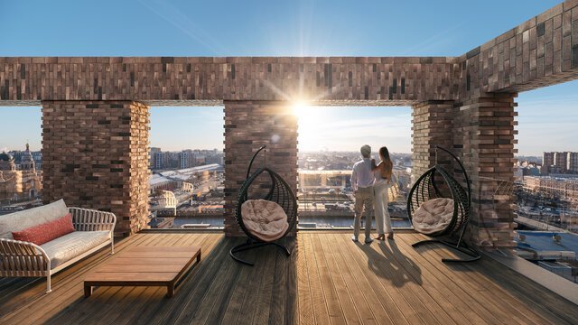Террасы предлагаются на верхних этажах, предоставляя жителям панорамные виды на исторический центр Петербурга и создавая уникальное открытое пространство для отдыха, приема гостей или создания собственного сада.