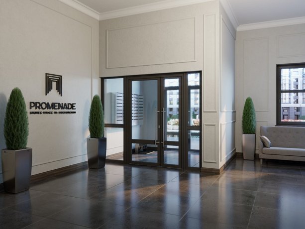 Просторные двухсветные лобби с зоной консьержа, отделанные мрамором, натуральным деревом и арт-объектами.